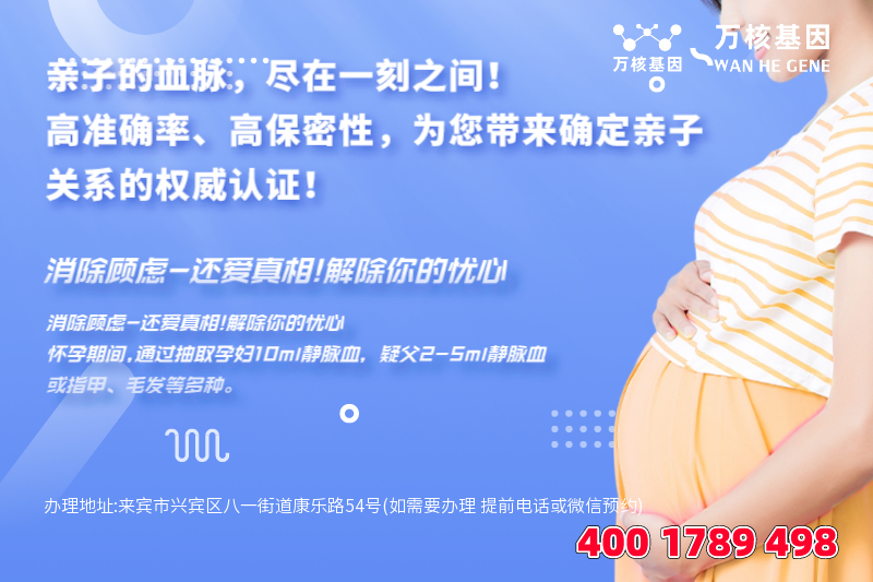 来宾亲子鉴定办理地址:来宾市兴宾区八一街道康乐路54号(如需要办理 提前电话或微信预约)-预约电话:4001789498,服务地区包括:兴宾区、忻城县、象州县、武宣县、金秀瑶族自治县、合山市等周边城市。